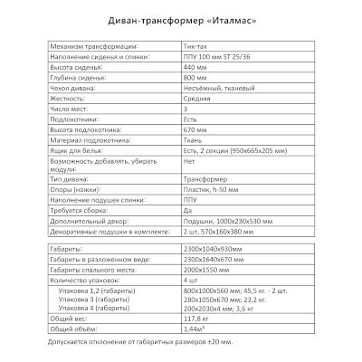 Диван-трансформер Италмас (Аквилон) продается в интернет-магазине mebel-online-yakutsk.ru по цене 73 376 руб. Есть доставка по Якутску и Республике Саха. Возможность подъема на этаж и сборки уточняйте у менеджера по телефону 8(800)505-27-11.